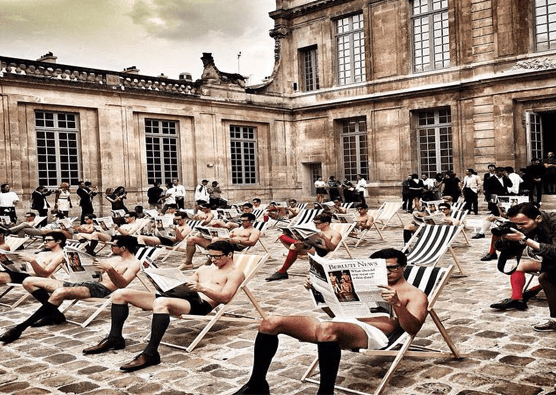 Alessandro staged a scene worthy of an Alberto Burri painting. Guests arrived for the Berluti Spring 2016 menswear show at the Musée Picasso in Paris greeted by models dressed in Berluti boxers, socks, and shoes lounging in striped beach chairs. On this affable display hosted during the Paris Fashion Week Men shows Sartori stated “I wanted to transport the guests into a radical version of reality”. And that he did.