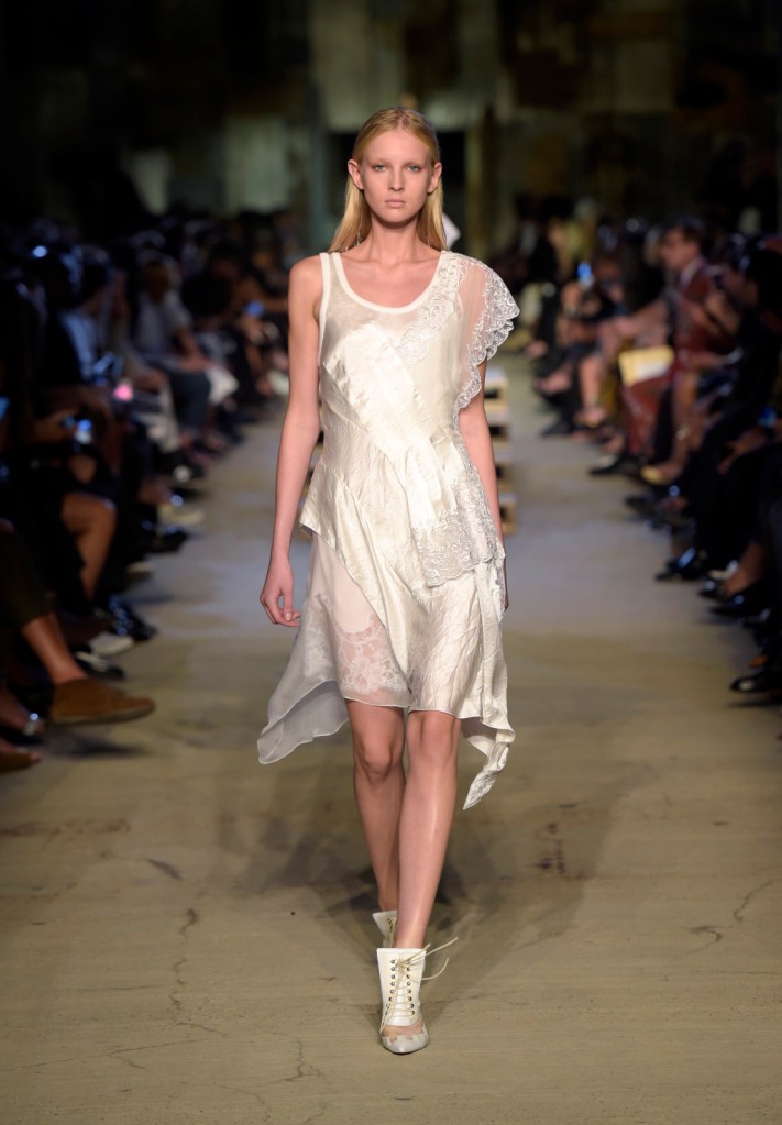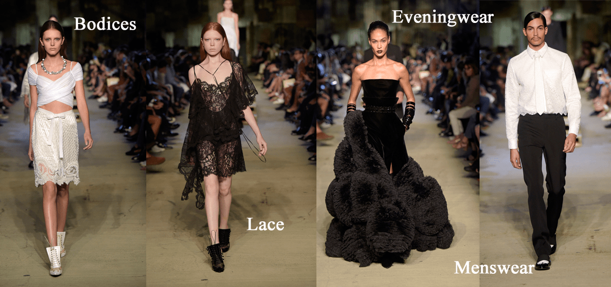 88 looks paraded down a custom-built set on a NYC rooftop on 9/11! 88 looks! I had to break the collection out, in order to break it down. 4 levels: of Bodices, Lace, Eveningwear and Menswear. Wow. It makes you wonder what was edit-ed out of the show!?! Ok, Let’s start:
