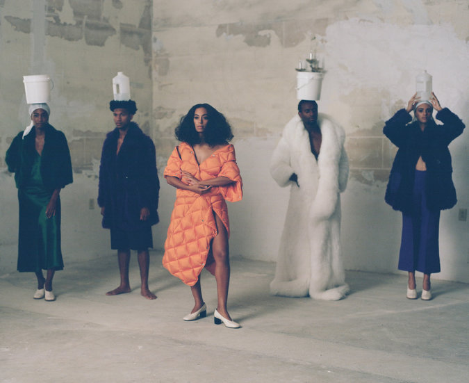 Ms. Knowles, center, in an Acne Studios coat and Tibi shoes. Credit Carlota Guerrero. I really want to find that white fur coat. I’m thinking – it’s vintageAcne Studios coat. They are so incredible with the design and construction of their outerwear. I’m not surprised she chose them.