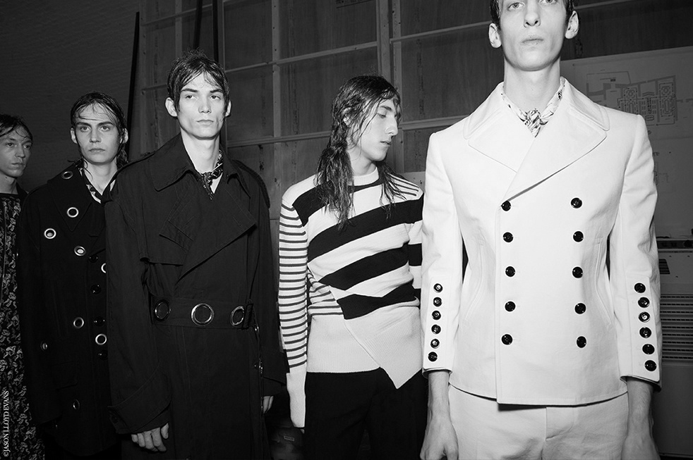 Alexander McQueen designer Sarah Burton planted a collar of inky scrolls across the lapels of a white cotton officer coat to open the Alexander McQueen show, announcing its seafaring theme and her single-minded focus on tailoring. Burton called hers a romantic take on sailor style, with some tempest roiling underneath the calm surface, musing: What compels men to map their life with ink? The tattoo prints – mostly mermaids, anchors and compasses – also could be seen on shirt cuffs and pointy collars, or splashed across duster coats and trenches.