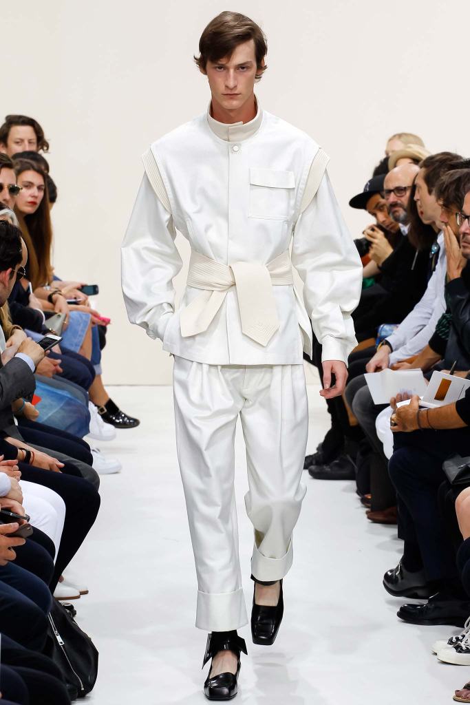 J.W. Anderson decided to “slow the tempo” with a more contemplative collection for spring 2016, crafted mainly in calico and dark denim. Asymmetric panels and funnel necks on loose, smocklike tops were a nod to David Bowie, said Anderson, who put everything over gently ballooning, cuffed and cropped “fisherman pants” with rows of pleats below the waistband. The gentle colors, crisp shapes and spoken-word soundtrack by American composer Robert Ashley cast a spell as surely as Bowie’s dreamy “Space Oddity.” It was an collection that recalled the more refined uniform of a fencer.