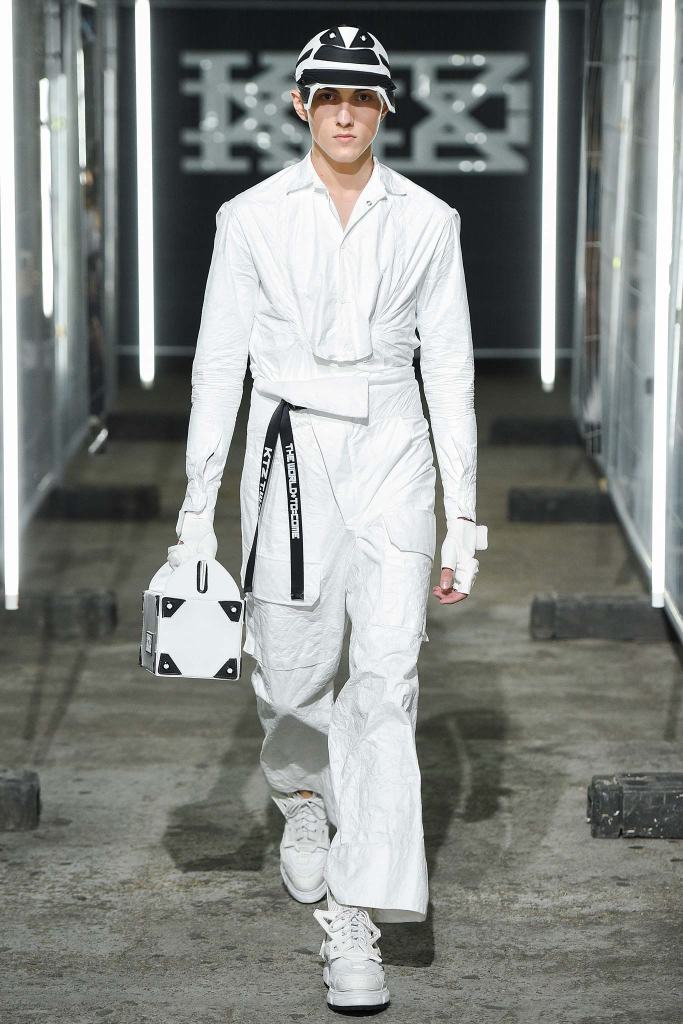 KTZ designer Pejoski said in his show notes that he’d wanted to work with “unusual industrial materials,” among them paper, rubber, aluminum and electrical tape, and the clothes looked more like objects that had been soldered together in a workshop than cut from material. One trenchcoat was made of panels of translucent white plastic and shiny black PVC, with seams in bright red and royal blue, while an oversize bomber was done in silver foil with net patches, and paired with matching shorts. Pejoski paired the looks with thick-soled walking sandals in shades of red, blue and bright white, which added to a graphic comic-book mood.