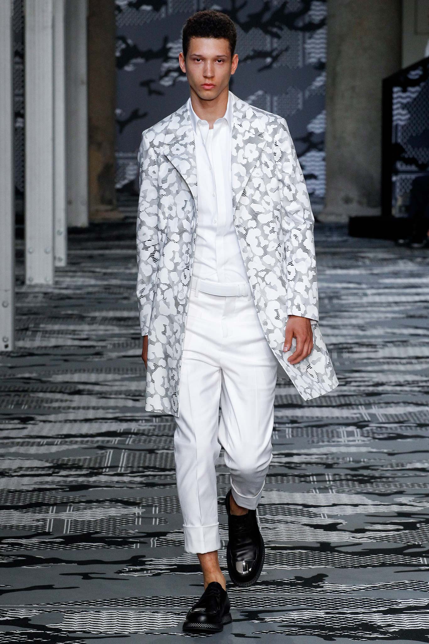 Neil Barrett Spring 2016 collection infused the contemporary workman’s lifestyle into his collection. His heritage as a son of a tailor presented itself through perfectly balanced coats and jackets. Neil Barrett once said, the balance is in the idea of trying to get the perfect, ideal iconic menswear pieces: the perfect parka, the perfect jean jacket, and offer them in one colorway (per print) per fabric. Your coat that’s one shape, you can buy it in jersey or in denim or in grey suiting but that’s been and made suitable to wearing a coat, and you have the same pant cuffs and the same suit so it’s all one color. So it’s giving you options of the same garment but perfect versions of them. In reality it’s only five actual garments but the cuts are slim or oversized, in the ideal color (and print) and ideal fabric” and shapes that can fit everyone.