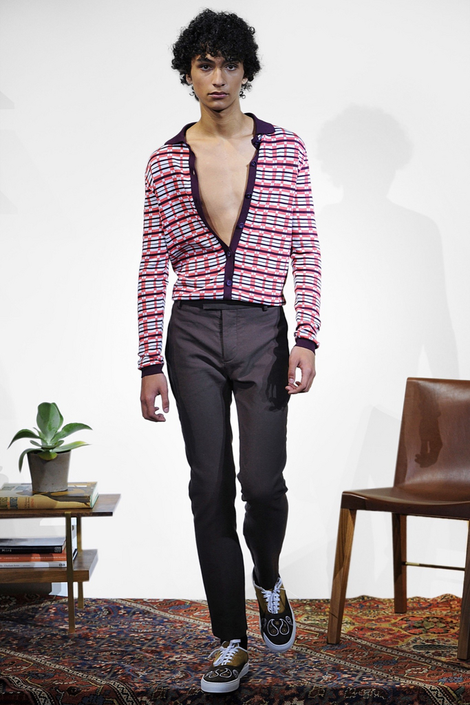 Richard Chai Spring 2016 collection featured relaxed silhouettes of wearable fashions with a charming youthful edge. The designer expanded his men’s wear offering in which he featured an array of voluminous pants and culottes — an emerging trend of the week; head-turning trenchcoats, and softly tailored suits. He also used updated pinstripes and plaids, that when mixed with album-inspired prints, brought new life to the heritage patterns.