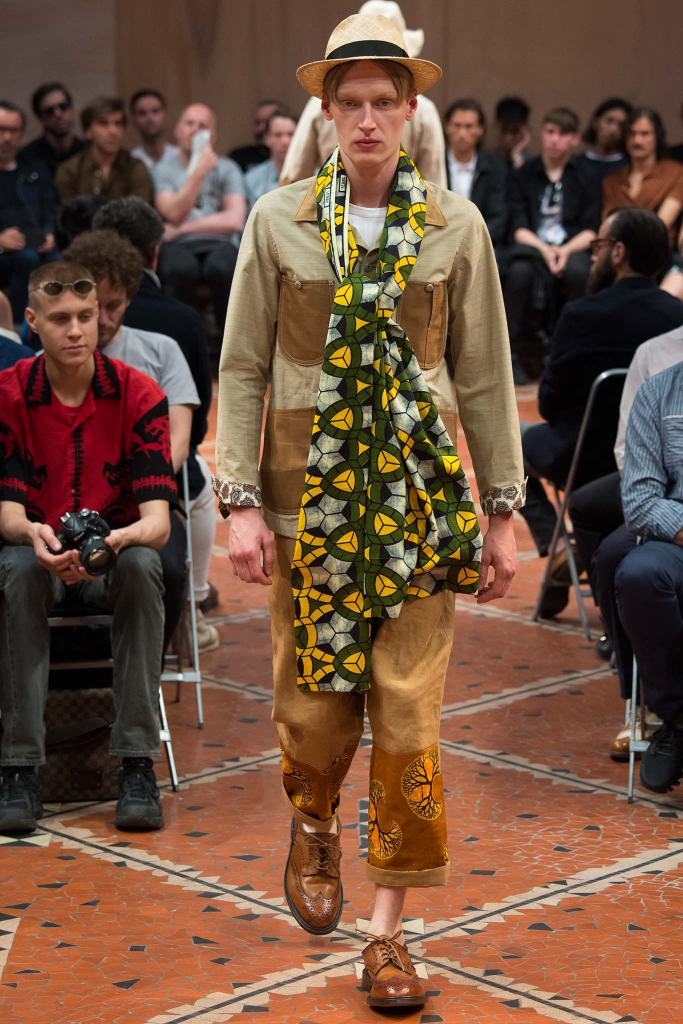Comme des Garcons Spring 2016 the designer took a scalpel to men’s suits. “I wanted to break down the art of tailoring to show how much value it has,” she said in a statement. Wearing artfully deconstructed outfits paired with polka-dot brogues, models in extravagantly sculpted fluorescent yellow wigs created by Julien d’Ys parlayed through a mid-renovation Haussmann-style apartment near the Paris Opera. Kawakubo carved right angles into a double-breasted coat in a tapestry fabric depicting British hunting scenes, providing glimpses of the tartan shirt worn underneath. Pants were slashed from the knee down. While the construction of jackets was flawless, there was nothing formal about how they were worn. Many were layered over tunics made of crisp shirting material, some with zip or buckle details, and Bermuda-length pleated culottes or baggy shorts, which gave the outfits an athletic spin.